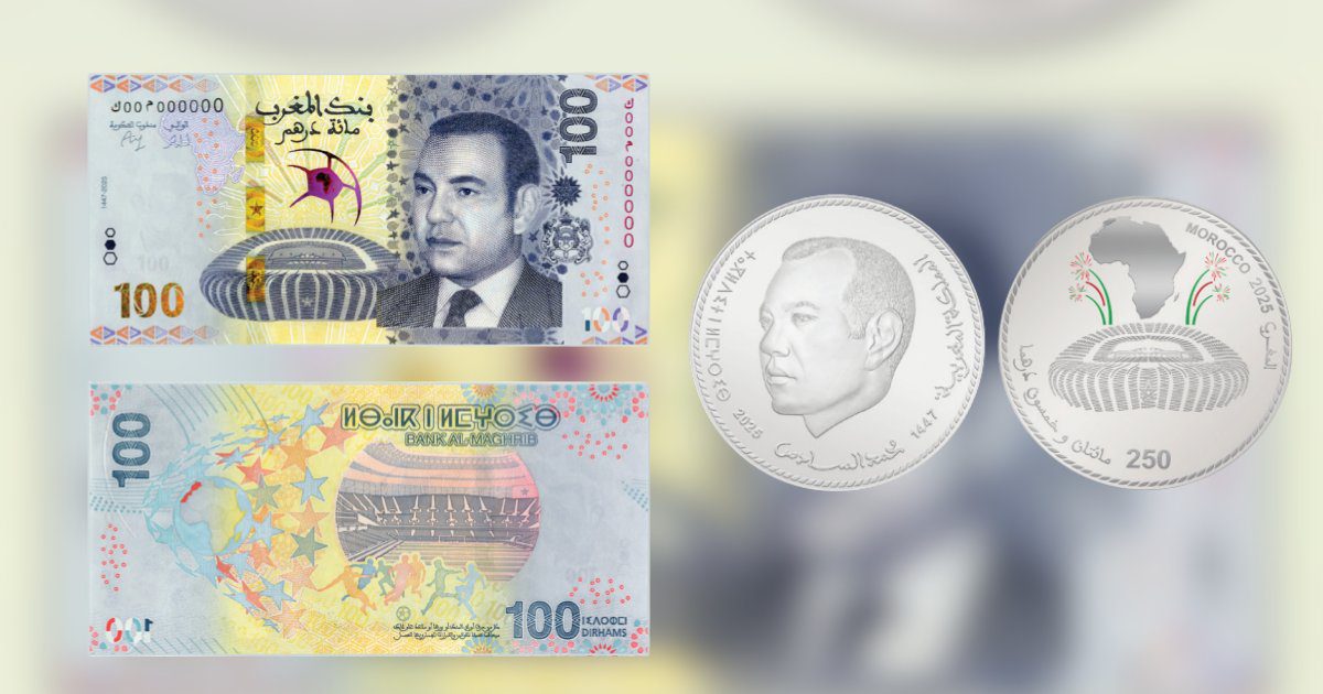 Bank Al-Maghrib (BAM) a annoncé, lundi, l’émission d’une pièce commémorative en argent d’une valeur faciale de 250 dirhams et la mise en circulation d’un billet commémoratif de 100 dirhams, à l’occasion de l’organisation de la 35ème édition de la Coupe d’Afrique des Nations Maroc 2025 (CAN 2025).